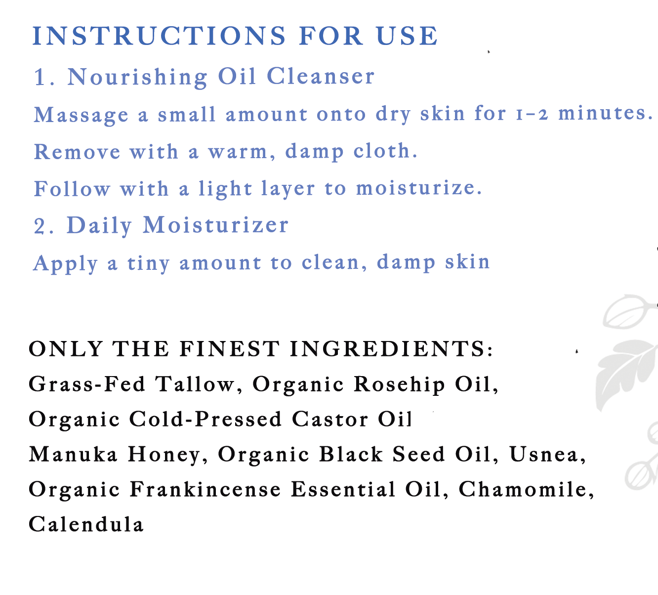 | Grass-Fed Tallow | Mimics skin’s natural sebum, packed with vitamins A, D, E, and K to deeply hydrate and restore the skin barrier. |