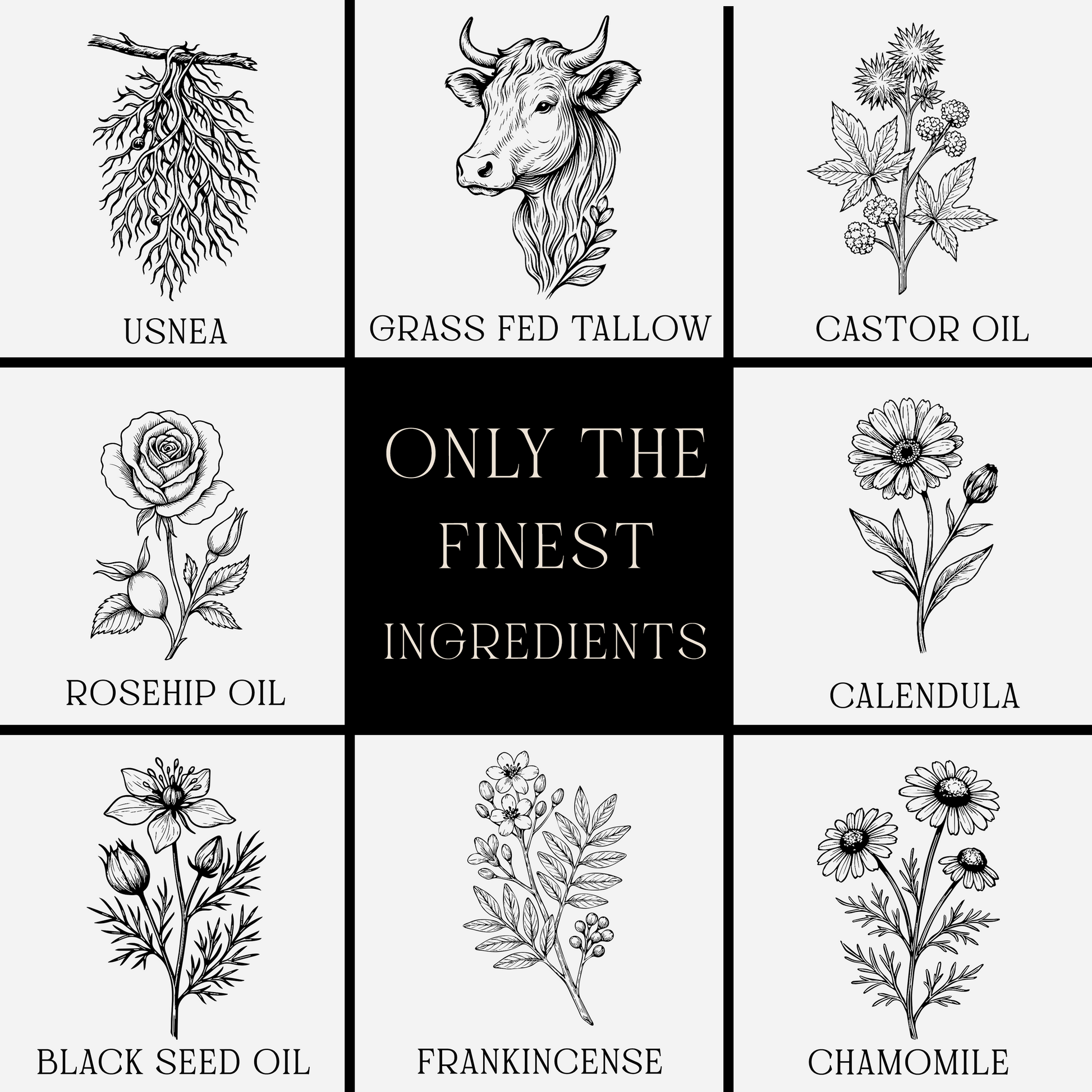 This hand-crafted tallow balm is an artisanal blend of nature’s finest organic ingredients, designed to cleanse, restore, hydrate, and protect your skin.